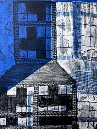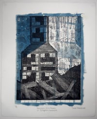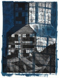 This piece is from a series depicting abandoned buildings across the US and experimenting with printing intaglio prints over cyanotypes. The cyanotype layer shows structural, pre-abandonment imagery and the intaglio shows post-abandonment imagery. The degradation of buildings often symbolize broader changes and period transitions in US history. The Remington Arms Factory was built in 1867 in Bridgeport, Connecticut. The factory was abandoned in 1988 due to deindustrialization and the company changing locations. As of 2020, the city plans on demolishing the factory but preserving the shot tower.