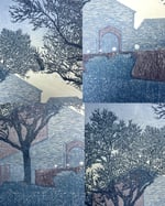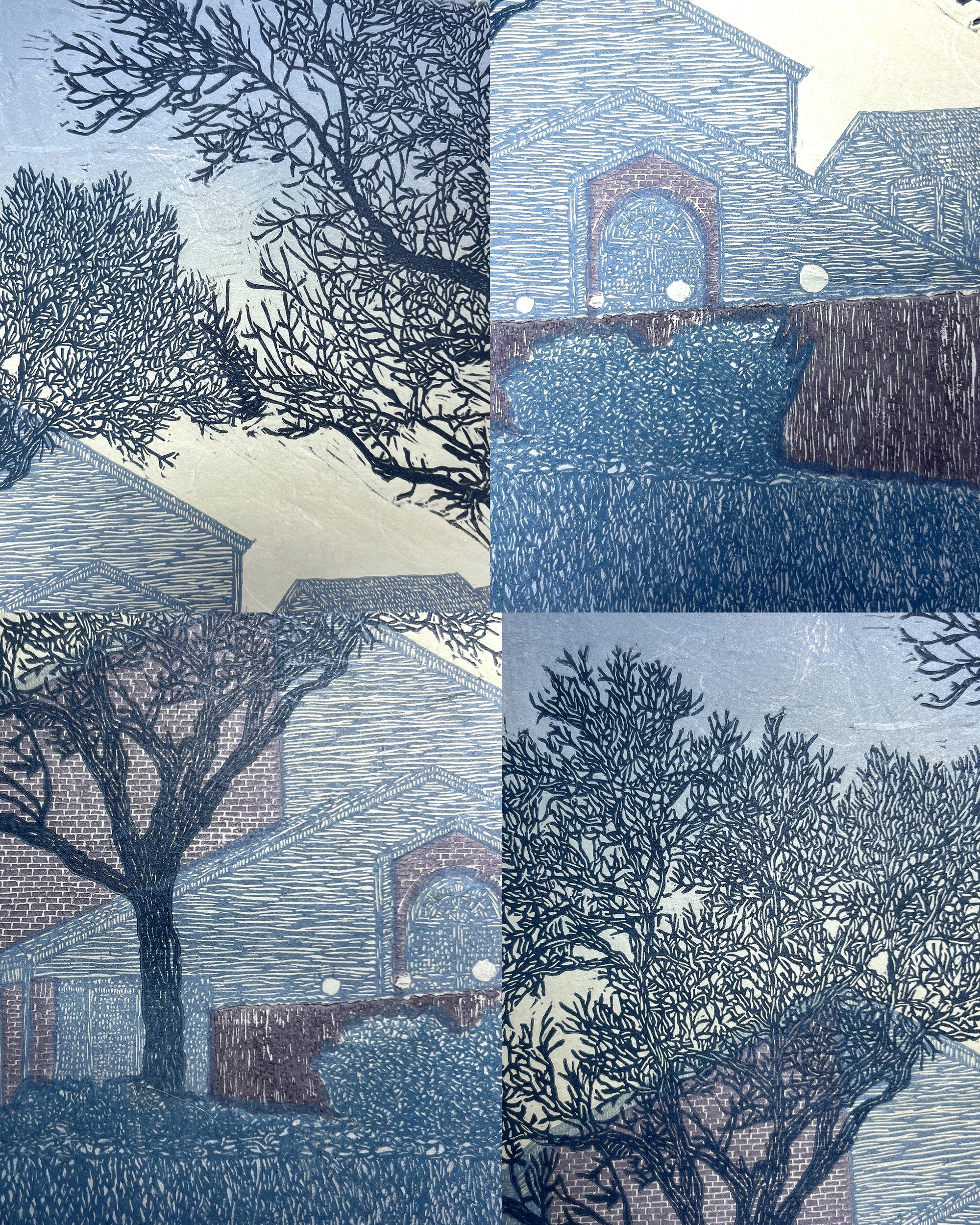 This print captures the last remaining sunlight of that day. The foreground and middleground contain silhouettes of trees that frame the buildings in the background. This print shows that beauty can be found in everyday routines, such as evening walks and the architecture you interact with daily.